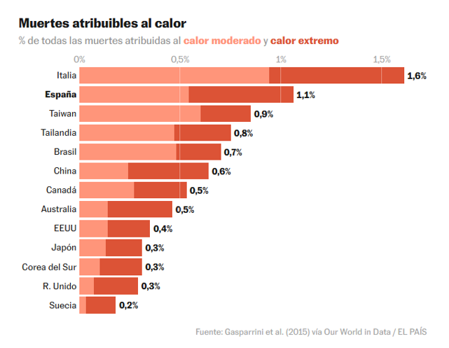 El País’te çıkan yazı “İspanya’da sıcaklık öldürüyor” diyor. Carlos III Sağlık Enstitüsü’ne göre, geçen yaz yaklaşık 2.000, ondan önceki yaz ise 3.000 ölüme sıcaklık neden oluyor. Çoğu yaşlı, ancak aralarında çocuklar ve her yaştan insan da var. Başka bir araştırmaya göre ise, sıcaklık İspanya’daki ölümlerin %1’inden sorumlu. Grafikte görüldüğü gibi, 13 ülkeden oluşan listede ikinci en kötü durumda.